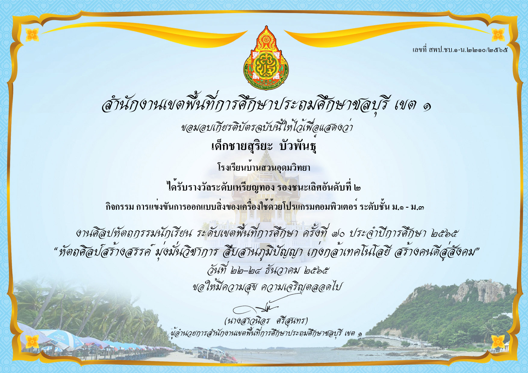 ได้รับรางวัลระดับเหรียญทอง รองชนะเลิศอันดับที่ 2 กิจกรรม การแข่งขันการออกแบบสิ่งของเครื่องใช้ด้วยโปรแกรมคอมพิวเตอร์ ม.1-ม.3