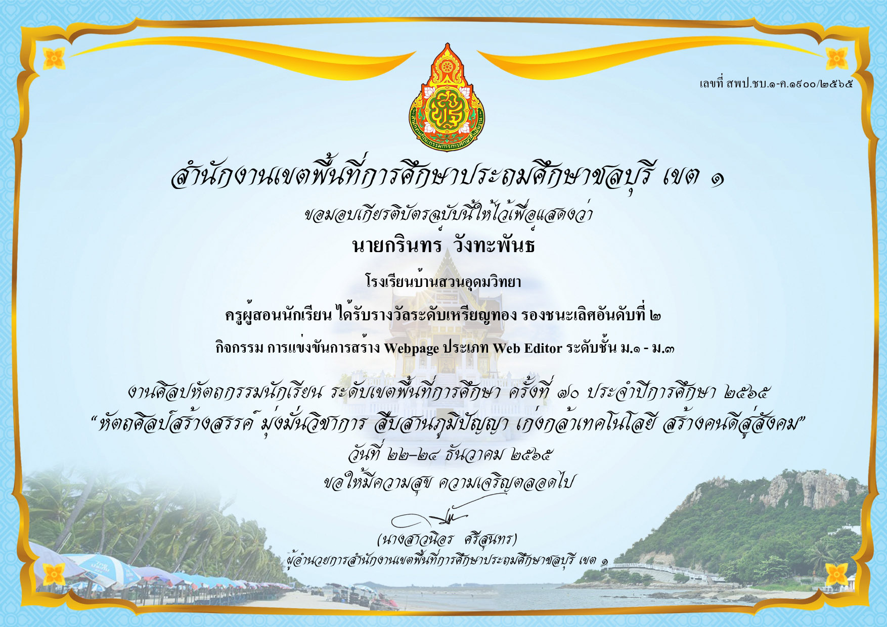 ครูผู้สอนนักเรียน ได้รับรางวัลระดับเหรียญทอง รองชนะเลิศอันดับที่ 2 กิจกรรมการแข่งขันการออกแบบสิ่งของเครื่องใช้ด้วยโปรแกรมคอมพิวเตอร์ ม.1-ม.3 |